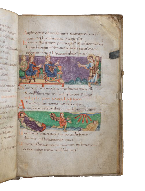 In de afbeelding onder aan de bladzijde zijn drie figuren te zien. Uiterst rechts ligt een man met bedekte handen uitgestrekt op de grond; hij heeft zijn droevige ogen gericht op de hemel. Dat laatste is ook het geval met de man op blote voeten in het midden, die met uitgestrekte handen biddend loopt in de richting van stralen die zijn weg verlichten; zijn ogen staan echter niet droevig, maar juist opgewekt. Links ligt een bebaarde man piekerend en met gesloten ogen op een slaapmatje. De eerst genoemde man lijkt te passen bij vers 25, waar de psalmist bidt: Mijn geest is geheel in het stof geworpen…