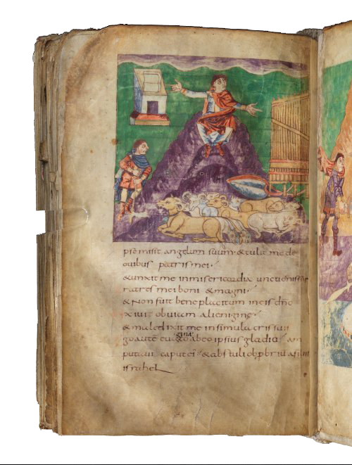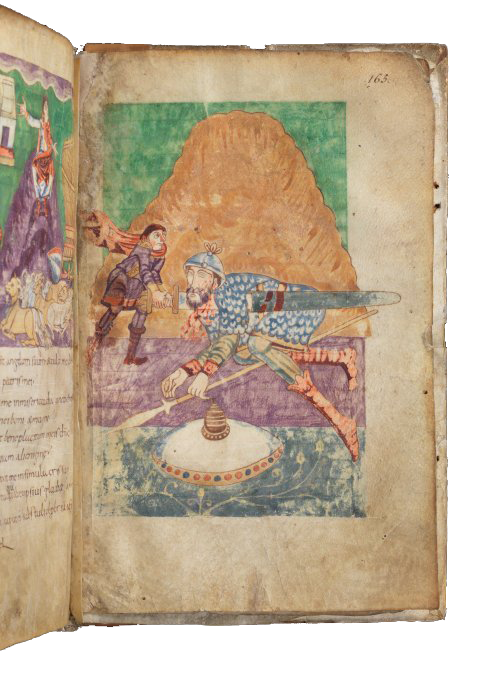 De kleine David trekt met beide handen het zwaard van Goliat uit de schede; de reus is geveld door een steen tegen het hoofd. Deze illustratie past bij de laatste verzen van de psalm: Toen zag ik een Filistijn, honend vanuit de slagordes der Filistijnen… Ik toog uit, deze eldersgeborene tegemoet, en hij vervloekte mij bij zijn goden. Maar ik trok zijn zwaard, bij hem vandaan; ik onthoofdde hem en nam de smaad van Israëls zonen weg.