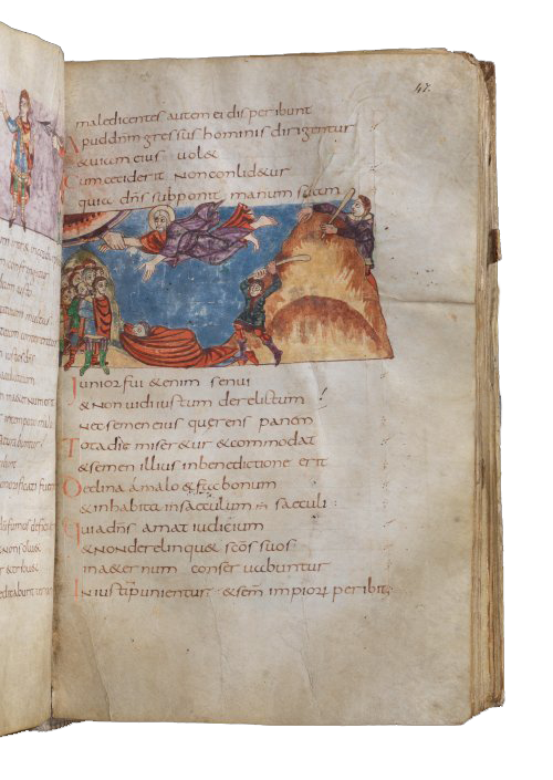 De hand van God grijpt de hand van een door de lucht vliegende man, met aureool, grijze haren en baard . Of valt hij na een achtervolging door een man met een knuppel van de berg af en wordt hij in zijn val door God bij de hand gegrepen? Plat op de aarde ligt iemand, die helemaal gehuld is in zijn mantel en die zijn verhulde handen uitstrekt naar een groep mannen die werkeloos lijken toe te kijken; zij hebben hun handen in hun gewaad verborgen. Rechts staat een man met een knuppel die op het punt staat om toe te slaan. Het is een illustratie van het 24e vers dat boven het beeld staat: Ook als hij (de rechtvaardige) struikelt zal hij niet vallen, want God ondersteunt zijn hand. In het latijn staat er letterlijk: Wanneer hij valt, zal hij niet in elkaar geslagen worden, want de Heer ondersteunt zijn hand. Dat is wat hier letterlijk wordt uitgebeeld. Op de grond ligt de gevallen rechtvaardige en boven wordt de vallende rechtvaardige door Gods hand gered. Wie zijn de mensen die links in beeld staan?
