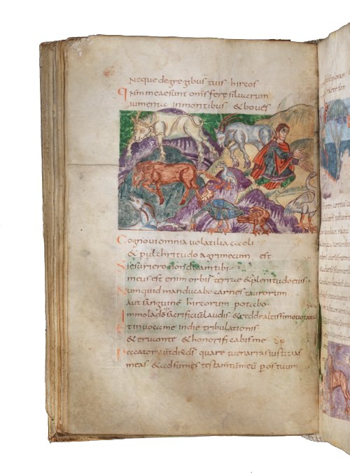 De psalmist bevindt zich in de bergen en biddend richt hij zich met ogen en handen naar de hemel. Hij staat met zijn rug naar allerlei vogels, bokken, een stier en een paard. Het is een illustratie bij de woorden van vers 10 die uit de mond van God komen: Want Mij behoren alle dieren in het woud, de duizenden die op mijn bergen zwerven.