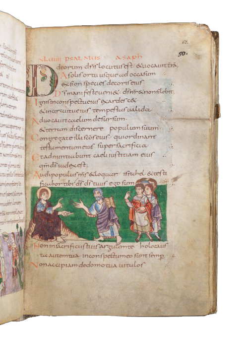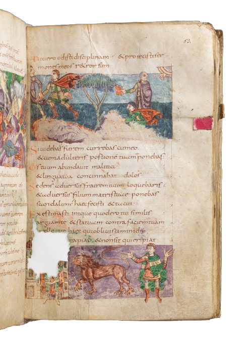 In het tweede beeld op deze bladzijde staat een man met opgeheven handen, hulpeloos toe te kijken hoe een leeuw naar een man loopt die voor een stadspoort staat; het blad is hier ernstig beschadigd. Wat wordt hier uitgebeeld, want de psalm spreekt in het geheel niet over een leeuw? De kerkvader Augustinus voegt aan vers 22 (Verstaat het toch, gij die aan God niet denkt, want anders grijp Ik u en niemand zal u redden) toe dat God toeslaat als een leeuw. Hij verwijst daarbij naar de leeuw uit de eerste brief van Petrus (5, 8): Wees waakzaam, wees op uw hoede, want uw vijand, de duivel, zwerft rond als een brullende leeuw, op zoek naar een prooi.