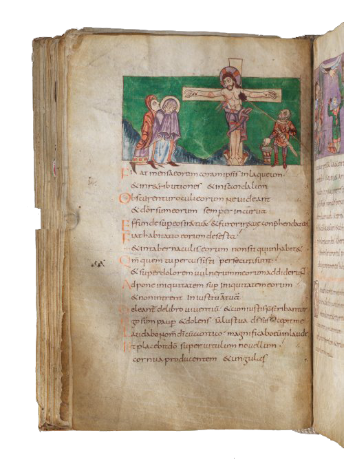 De ik-persoon uit de psalm is hier Jezus geworden. Uit zijn zijde stroomt bloed. Hij kijkt naar zijn moeder, die haar ogen heeft neergeslagen en haar gezicht half bedekt met haar handen; zij heeft een aureool om het hoofd. Achter haar staat een andere vrouw die naar hem opkijkt. Aan zijn linkerzijde staat een soldaat met een emmer; in zijn rechterhand houdt de soldaat een stok met een spons, die hij Jezus aanbiedt om te drinken. Volgens de opvatting van de kerkvaders is vers 22 (… zij lesten mijn dorst met azijn) tijdens de kruisiging van Jezus in vervulling gegaan. Zo valt ook te lezen in het lijdensverhaal volgens Johannes (19, 25-30). In het Getijdenboek (p. 1071) wordt vers 22 als tweede antifoon gebruikt.