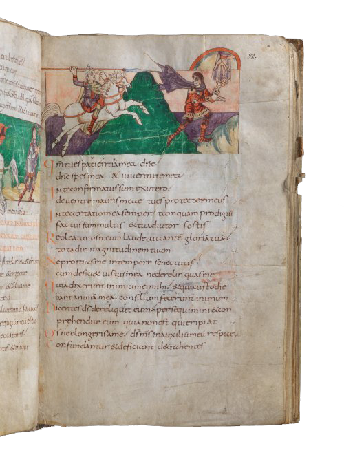 Angstig achterom kijkend naar de gewapende ruiter die hem achtervolgt, rent de psalmist over de bergen, terwijl hij zijn handen biddend uitstrekt. Zijn gebed wordt beantwoord door de hand van God die vanuit de hemelboog naar hem wordt uitgestrekt. De ruiter wijst naar zijn ogen, alsof hij wil zeggen: ik heb je gezien. Het is een verbeelding van het gebed van de psalmist om bevrijding uit de handen der zondaars. De kunstenaar volgt nauwgezet de Latijnse tekst, want het laatste deel van vers 3 luidt letterlijk: … want mijn firmament en mijn toevlucht zijt Gij. En dus komt de hand van God uit het firmament oftewel de hemelboog.