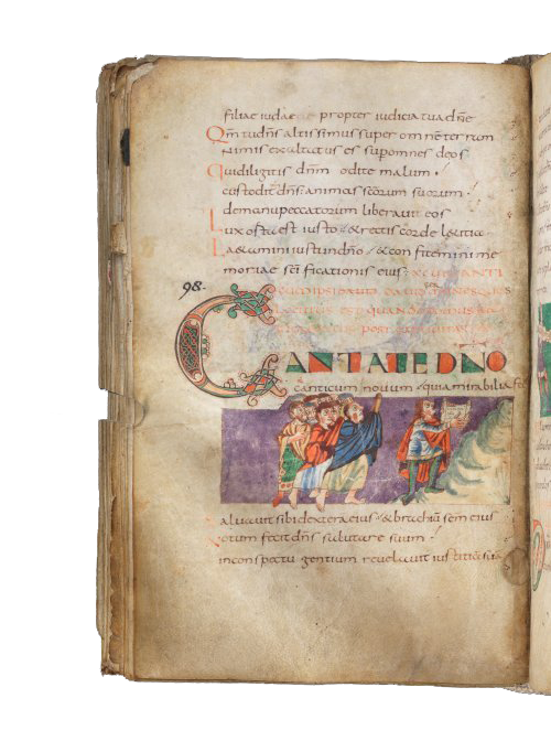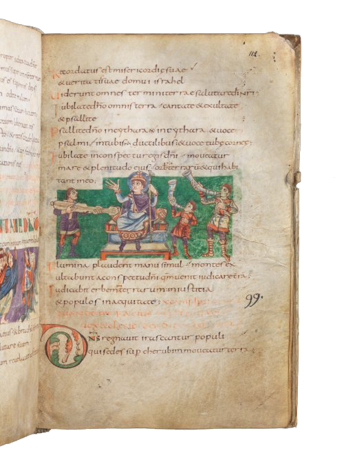 Op een troon zit Christus, gekleed als een koning, met de kruisstaf in de hand en met een blauwe aureool om het hoofd. Hij kijkt in de verte. Met open hand luistert hij naar de muziek die voor hem gemaakt wordt. Aan zijn rechterhand staat een citerspeler en aan zijn linkerhand staan twee hoornblazers, die naar de koning wijzen. Zij doen waartoe de psalmist hun in de verzen 5 en 6 oproept: Zingt voor de Heer bij de citer, met citer- en psalterspel. Laat schallen trompet en bazuin… De opgeheven hand van Christus zou ook een verwijzing kunnen zijn naar vers 1b: Zijn hand deed zich krachtig gelden, de macht van zijn heilige arm.