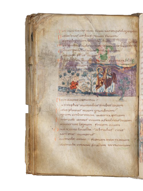 Rechts staan Mozes en Aäron uit vers 26 tussen twee vijgenbomen in; met bedekte handen kijken zij naar de hemel. Daar verschijnt de hand van God die hun een stok aanreikt, waarmee zij de tekenen van de heer kunnen stellen (Exodus 4, 17). Links zit een Egyptenaar die door twee plagen getroffen wordt. De kikkers uit vers 30 bespringen hem en bijten hem.