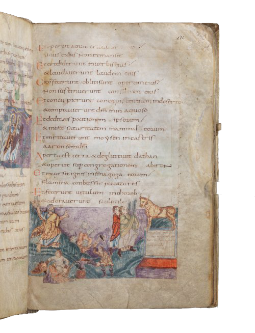 De afbeelding sluit aan bij vers 19: Zij maakten een heilig kalf bij de Horeb en wierpen zich neer voor een gietsel van goud. Het is een verwijzing naar het verhaal in Exodus 32. Links in het beeld komt Mozes (Moyses staat er boven zijn hoofd) de berg af met de twee stenen tafelen. Hij ziet het gouden kalf aan de overkant en wijst er na. Uit woede smijt hij de platen stuk tegen de grond. Voor het gouden kalf staan twee mannen met palmtakken in de hand. Op de sokkel onder het beeld staat een tekst in het Latijn: Dit is het kalf, dat de Joden uit puur goud hebben gemaakt, en zij hebben het aanbeden als God. Linksonder zijn twee smeden bezig het beeld te maken.