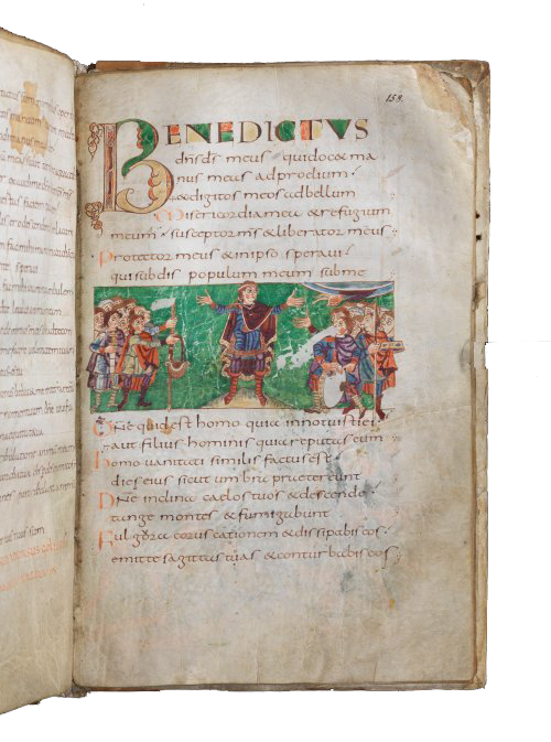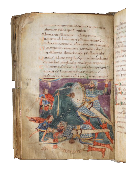 Onder de zegenende hand van God staat de kleine David met zijn stok en zijn slinger tegenover de reusachtige en zwaarbewapende Goliat, die dreigend op hem afkomt; hij is reeds door een steen aan zijn hoofd geraakt. Een verdieping lager trek David met beide handen het enorme zwaard uit de schede om daarmee de gevelde reus het hoofd af te slaan. Het verhaal is te lezen in het eerste boek Samuel (17, 41-51). In vers 10 van de psalm komt het zwaard ter sprake: …die David, uw dienaar, gered hebt van het verraderlijke zwaard.